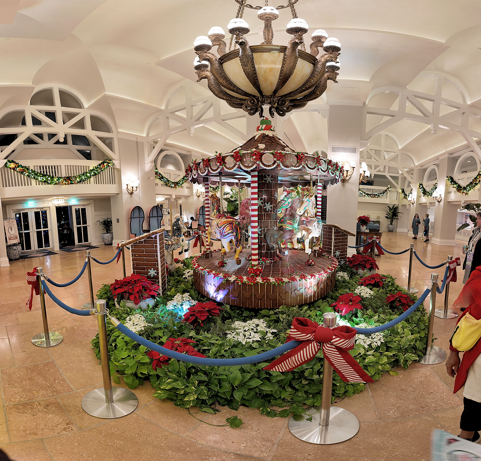 At Disney’s Beach Club Resort, the gingerbread carousel returns as a long-standing holiday feature. Unlike the static displays at other resorts, the Beach Club’s design is fully rotating, with gingerbread figures arranged around a central carousel structure in the lobby.